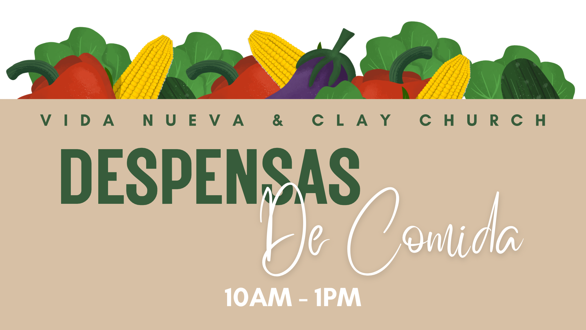 En colaboración con Clay Church, nuestra despensa móvil se lleva a cabo una vez al mes, de 10 a.m. a 1 p.m. Voluntarios de nuestros grupos de mujeres, hombres y jóvenes participan empacando alimentos y entregando despensas, mientras que también ofrecemos apoyo espiritual a través de oración. Las fechas se comunican con anticipación, y cualquiera puede acercarse para recibir ayuda. Este servicio ha sido parte de nuestra comunidad durante varios años.